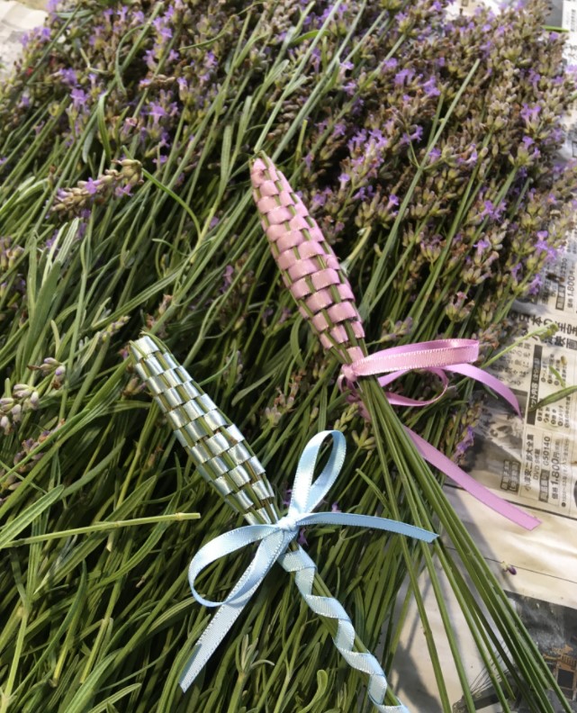 (株)東農園の協力のもと、23名の老若男女が雨天にもかかわらず、ラベンダーの摘み取り体験やリボンで穂を編み込んだスティックづくりを楽しみました。